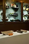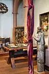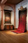 Man har valgt at vise en stor del af udstillingen midt i de faste kulturhistoriske samlingsrum i museets hovedbygning. Enkelte gange er det succesfuldt, men desværre oftest til forvirring og ulempe for værkerne. Man kommer reelt på skattejagt i disse svagt belyste rum, hvor man må prøve at finde udstillingens værker mellem glaskunst fra 1700-tallet og nygotiske kjoler fra det sene 1800-tal. Selv når værkerne fungerer godt sammen med den faste samling, som for eksempel i Guri Sandviks taktile lerkummer eller Siri Berqvams tekstilkande Implantat (2022), virker det som om udstillingen ikke helt kan finde ud af, hvilken plads de nye værker skal have. Ofte er de ikke ordentligt belyst og de balancerer derfor – til stor forvirring – mellem at blende ind i den faste udstilling og samtidig være unikke og kontemporære kontekstualiseringer. Dette er synd for mange gode værker er repræsenteret her – alt fra Eva Schjølbergs tekstile undersøgelse af begær, over Irene Nordlis fantastiske barok-abstrakte keramikværk Beholder nr. 23 (2022), til smukke tekstilarbejder med højaktuelle temaer fra Kristin Sæterdal, Kristina D. Aas og Line Solberg Dolmen.